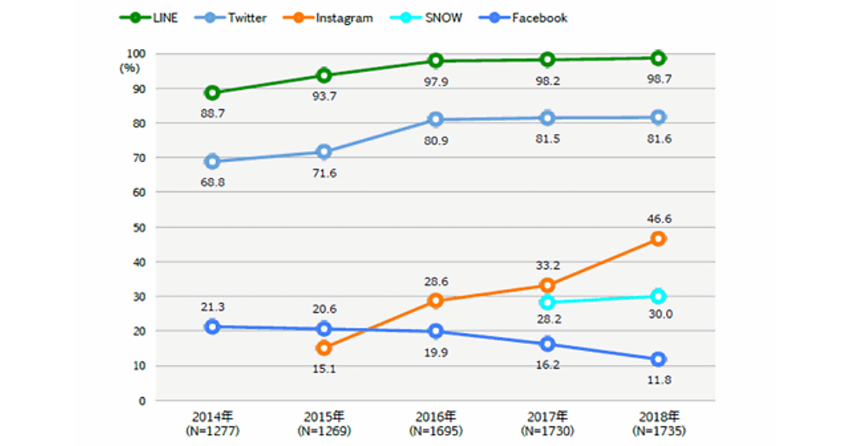 SNS利用:LINE、Twitterの2強変わらず。Instagramは男女共に2桁増