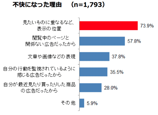 不快になったことがあると答えた1,793人に対してその理由を複数回答で聞いたところ、「見たいものに重なるなど、表示の位置」が73.9%、「閲覧中のページと関係ない広告だったから」が57.8%となった。