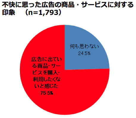 不快に思った広告の商品・サービスに対する印象を聞いたところ「購入・利用したくないと思った」が75.5%、「何も思わない」が24.5%となった。