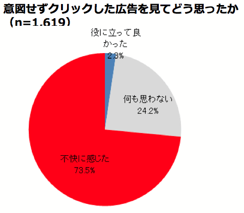 前問で「ある」と答えた1,619人に、意図せずクリックした広告についてどう思ったかを聞いたところ、「不快に感じた」が73.5%、「何も思わない」が24.2%となった