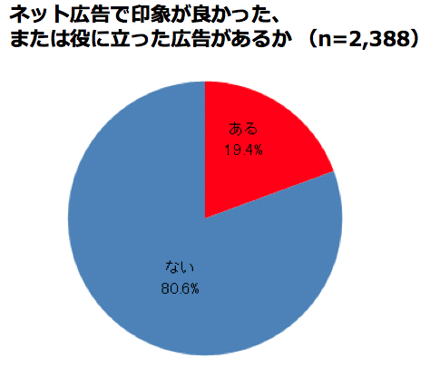 「あなたが今まで見たネット広告で印象がよかった、または役立った広告はありますか?」との質問に対しては、「ある」19.4%に対して「ない」80.6%となった。