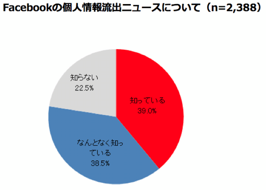「Facebookの個人情報流出についてのニュース(*)を知っていますか?」との質問に対して、「知っている」が39.0%、「なんとなく知っている」が38.5%、「知らない」は22.5%であった。