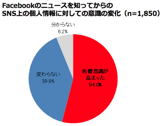 前項でニュースを「知っている」「なんとなく知っている」と答えた1,850人に対して「ソーシャルメディア上での個人情報について意識の変化」を聞いたところ、「危機意識が高まった」は54.0%、「変わらない」が39.8%となった。