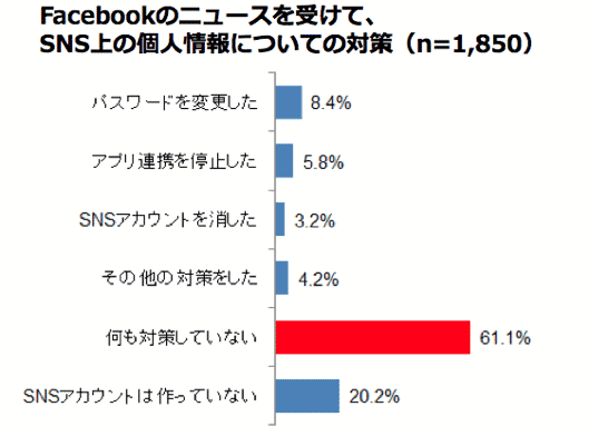ニュースを受けてソーシャルメディア上の個人情報について対策したかを聞いたところ、「何も対策していない」が61.1%に上った。対策内容としては、パスワード変更(8.4%)、アプリ連携の停止(5.8%)、SNSアカウントの削除(3.2%)など。