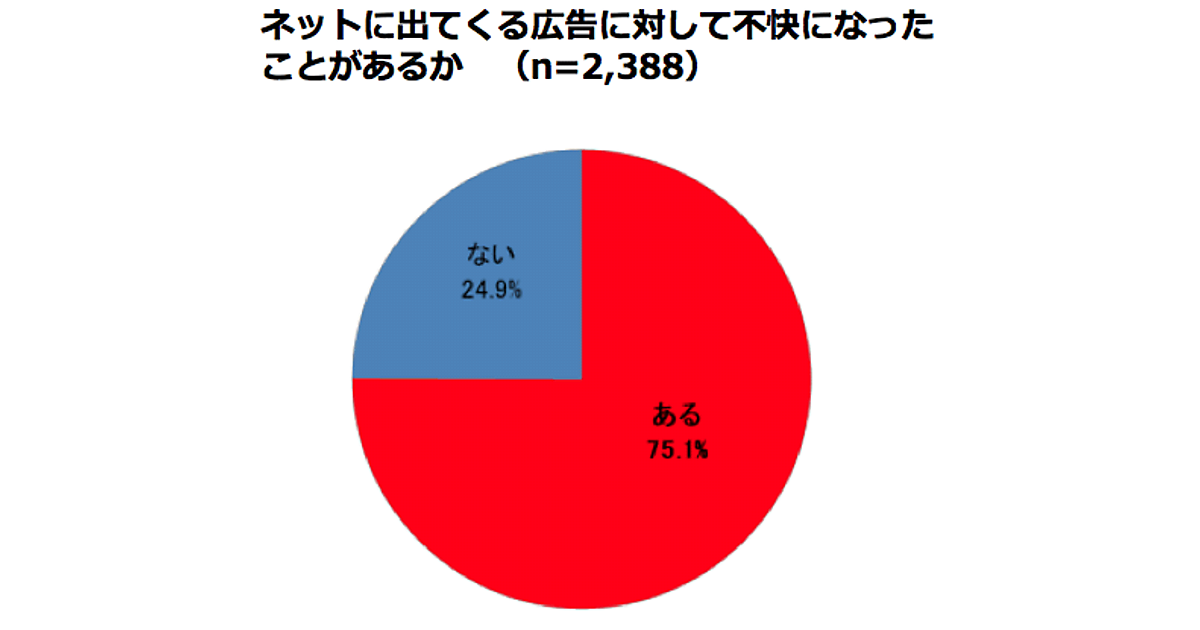 「ネットに出てくる広告に対して不快になったことはありますか?」との設問に対し、75.1%が「ある」と答えた。