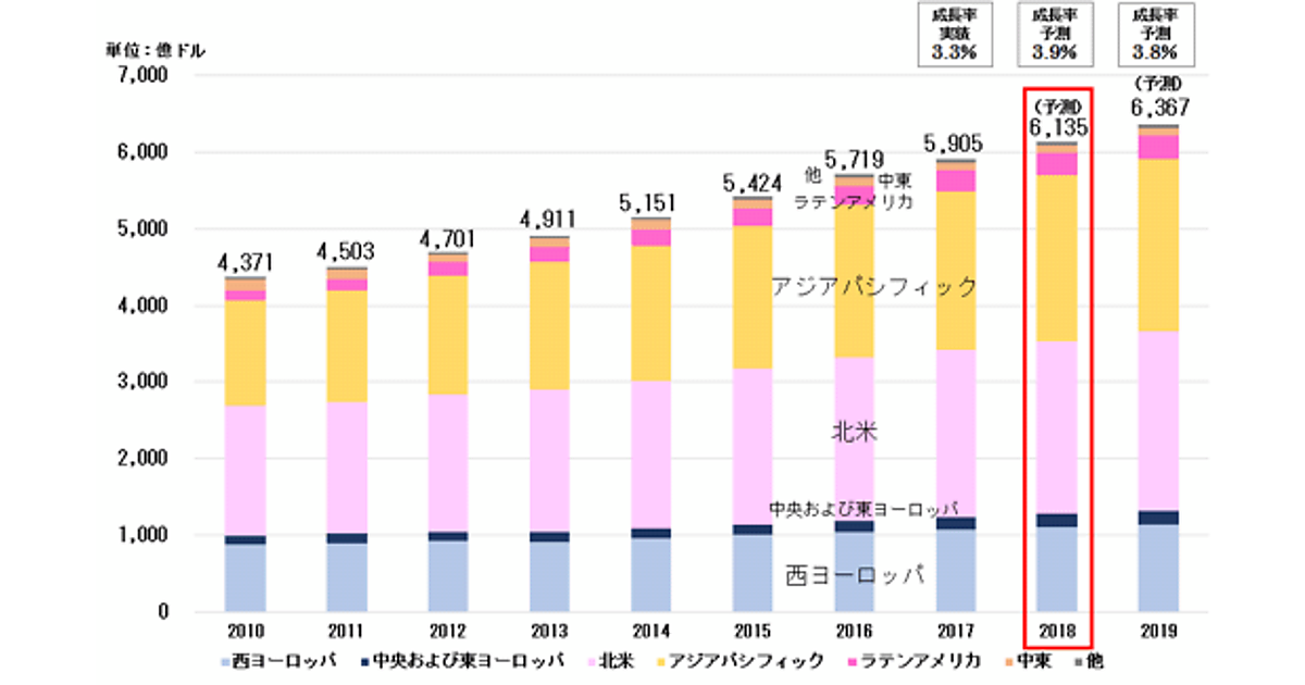 地域別にみると、市場規模で世界1位、2位にある米国と中国に加え、西ヨーロッパの英国やフランス、また東ヨーロッパのロシアなどが堅調であることから、ラテンアメリカを除く全地域が上方修正されている。