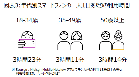 一人あたりの利用時間をみると、18~34歳が最も長く3時間23分となったが、50歳以上(3時間14分)、35~49歳(3時間11分)との差異は小さく、全年代でスマートフォンからのインターネット利用が活発であるようすがうかがえる。