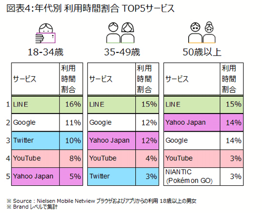 各年代の利用時間が長いサービスをみると、全年代で「LINE」が15~16%を占め、1位となっている。18~34歳では「Twitter」や「YouTube」、35歳以上では「Yahoo! JAPAN」の利用時間が長い。また「ポケモンGO」が50歳以上の5位にランクインしており(利用時間割合3%)、中高年からの人気を裏付けている。