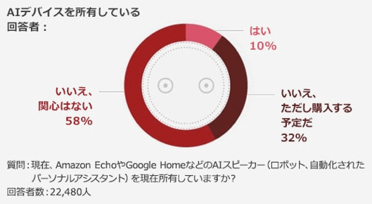世界の回答者のうち、Amazon Echo、Google Homeをはじめとする自動パーソナルアシスタント(「スマートスピーカー」とも)やロボットなどのAIデバイスを所有している人の割合は10%という結果であった。今後購入予定があるとした回答は32%に上り、関心が高まっていることがうかがえる。
