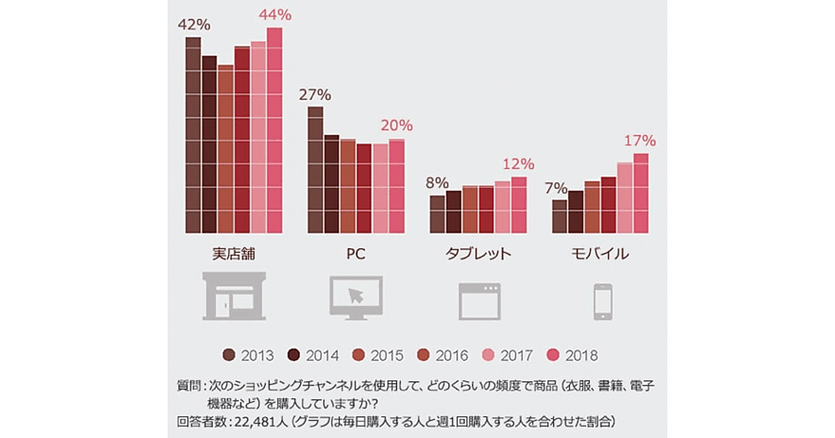 購入チャネルをみると、モバイルデバイスを利用した購入は世界で17%と、過去6年で倍増。PCを利用した購入(20%)を超える勢いとなっている。