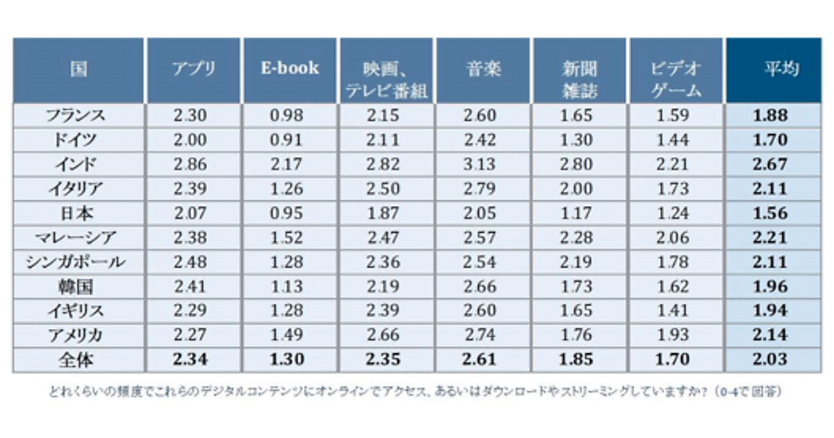 アプリや電子書籍、音楽配信などのデジタルコンテンツをどのくらいの頻度でダウンロードするかを尋ねたところ、日本は世界と比較して最も平均値が低い結果となった(下表はアクセス/ダウンロード/ストリーミングの頻度を0〜4で尋ね、その平均値を算出したもの)。