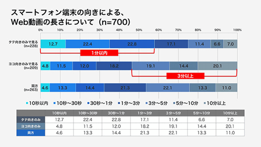 タテ向きでは1分以内、ヨコ向きでは3分以上の動画が好まれる