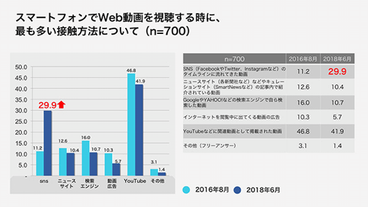 スマートフォンでのWeb動画との接触について質問したところ、SNSのタイムラインをきっかけに動画を視聴している人が29.9%に上った。第3回(2016年8月、11.2%)との比較では約2.7倍に増えている。なお、最多はYouTubeの関連動画(41.9%)。