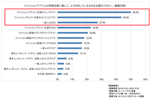 オンラインでの情報収集に関しては、「ファッションブランド/企業のウェブサイト」(50.2%)、「ファッションブランド/企業のモバイルアプリ」(43.5%)が上位を占め、「一般人のSNS」(27.5%)が続いた。