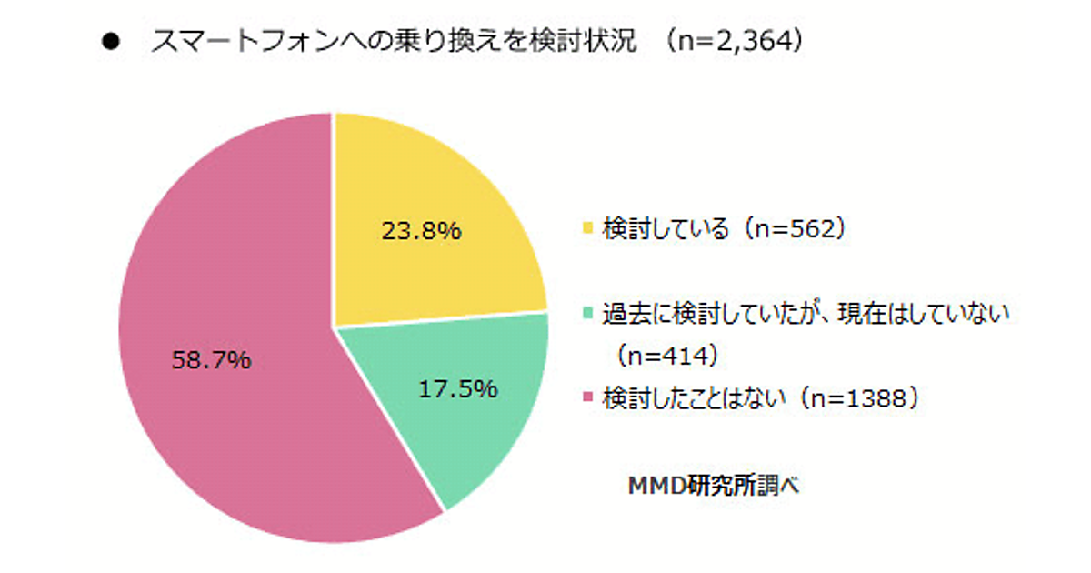 事前調査において、フィーチャーフォンを利用している全国の男女2,364人を対象に、スマートフォンへの乗り換えを検討したことがあるかきいたところ、「検討している」が23.8%、「過去に検討していたが、現在はしていない」が17.5%、「検討したことはない」が58.7%だった。