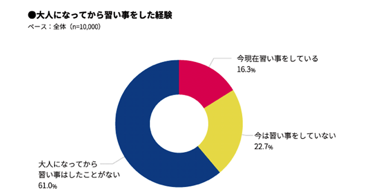 大人になってから習い事をした経験を全国の男女10,000名に尋ねたところ、「経験あり」は39.0%となった。また、全体の16.3%が現在も習い事を継続中だった。
