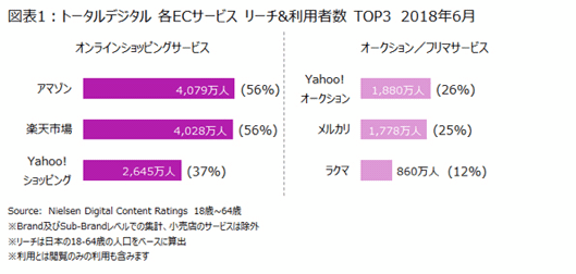 オンラインショッピングサービスでは「アマゾン」が4,079万人(リーチ:56%)で1位となり、次いで「楽天市場」がほぼ同数の4,028万人(56%)、3位は「Yahoo!ショッピング」で2,645万人(37%)となった。