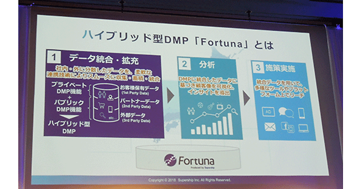 データテクノロジーカンパニーのSupershipは、10月11日に事業戦略発表会を行い、ハイブリット型DMP「Fortuna(フォーチュナ)」の提供を始める、と発表した。