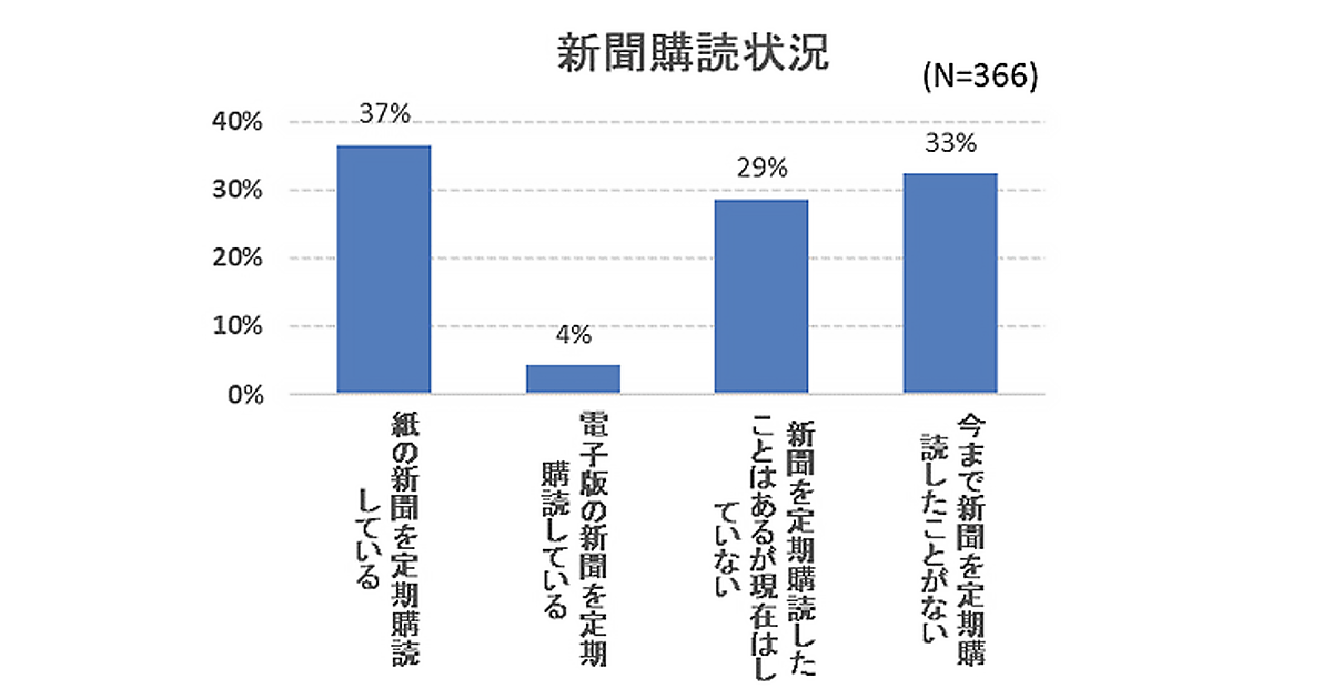 新聞の購読状況を聞いたところ、「紙の新聞を定期購読している」が37%、「電子版の新聞を定期購読している」が4%となり、新聞を購読中の保護者は4割にとどまった。「新聞を定期購読したことはあるが現在はしていない」が29%、「今まで新聞を定期購読したことがない」は33%。