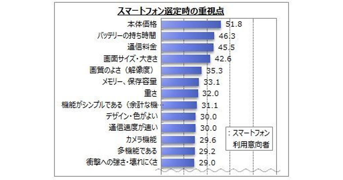 スマートフォン利用意向者に選定時の重視点を聞いたところ(複数回答可)、「本体価格」(51.8%)、「バッテリーの持ち時間」(46.3%)、「通信料金」(45.5%)、「画面サイズ・大きさ」(42.6%)などが上位に挙がった。