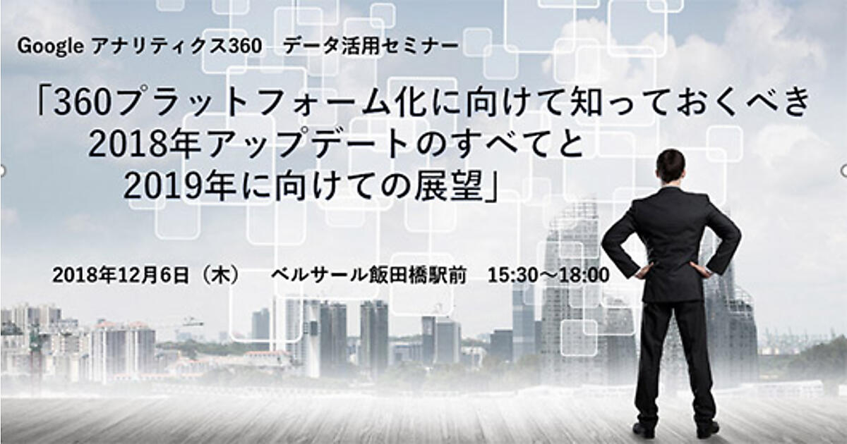 Google アナリティクス360 データ活用セミナー「360プラットフォーム化に向けて 知っておくべき2018年アップデートのすべてと2019年に向けての展望」が12/6(木)に飯田橋で開催される。