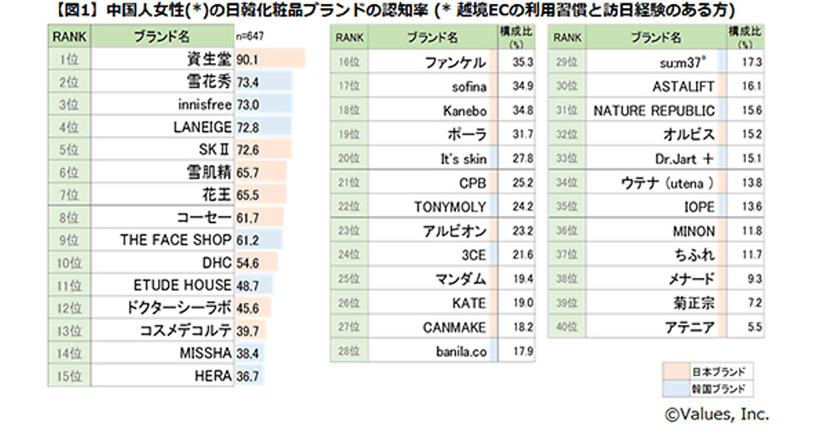 事業成長支援サービスを提供するヴァリューズは、中国本土でインターネットリサーチを実施し、中国人女性の「日本と韓国の化粧品ブランド認知状況」について調査した。