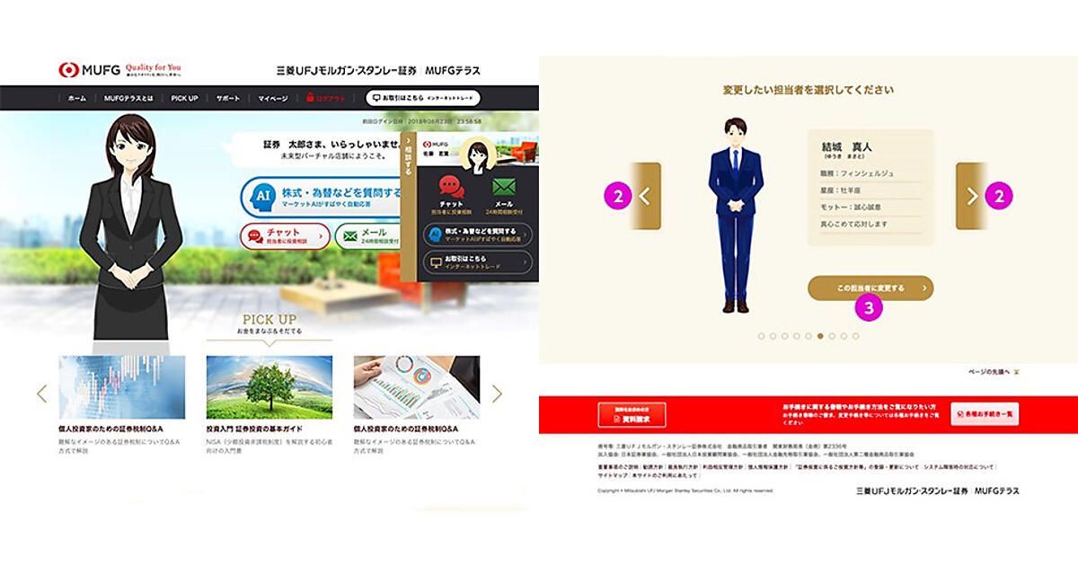 三菱UFJモルガン・スタンレー証券が、このサービスを使ったバーチャル支店「MUFGテラスサイト」を同日開設。顧客が投資相談すると、バーチャル担当者「フィンシェルジュ」が実店舗で答えるように接客する。人工知能(AI)が回答する無人チャットでの株価情報や、専門家による有人チャットの投資相談などでスタートした。