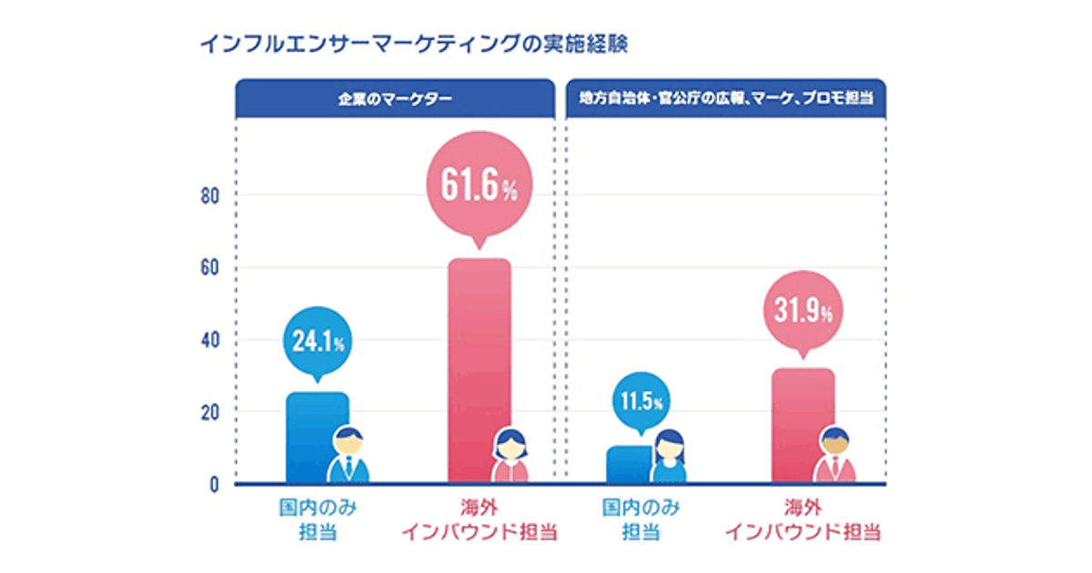 インフルエンサーマーケティングの実施経験率は、海外やインバウンドを担当する企業のマーケターで最も高く、6割を超える。一方、国内のみの担当者では24%。地方自治体や官公庁の海外/インバウンド担当者では3割を超える。