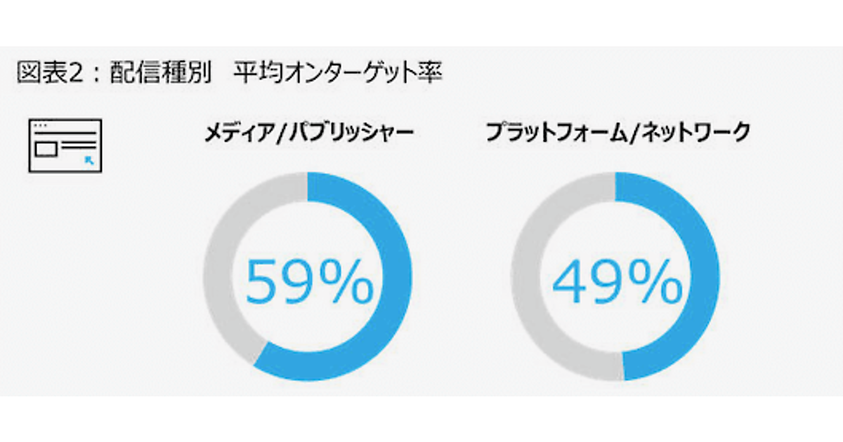 配信種別:純広告のオンターゲット率は59%。アドネットワークでは49%