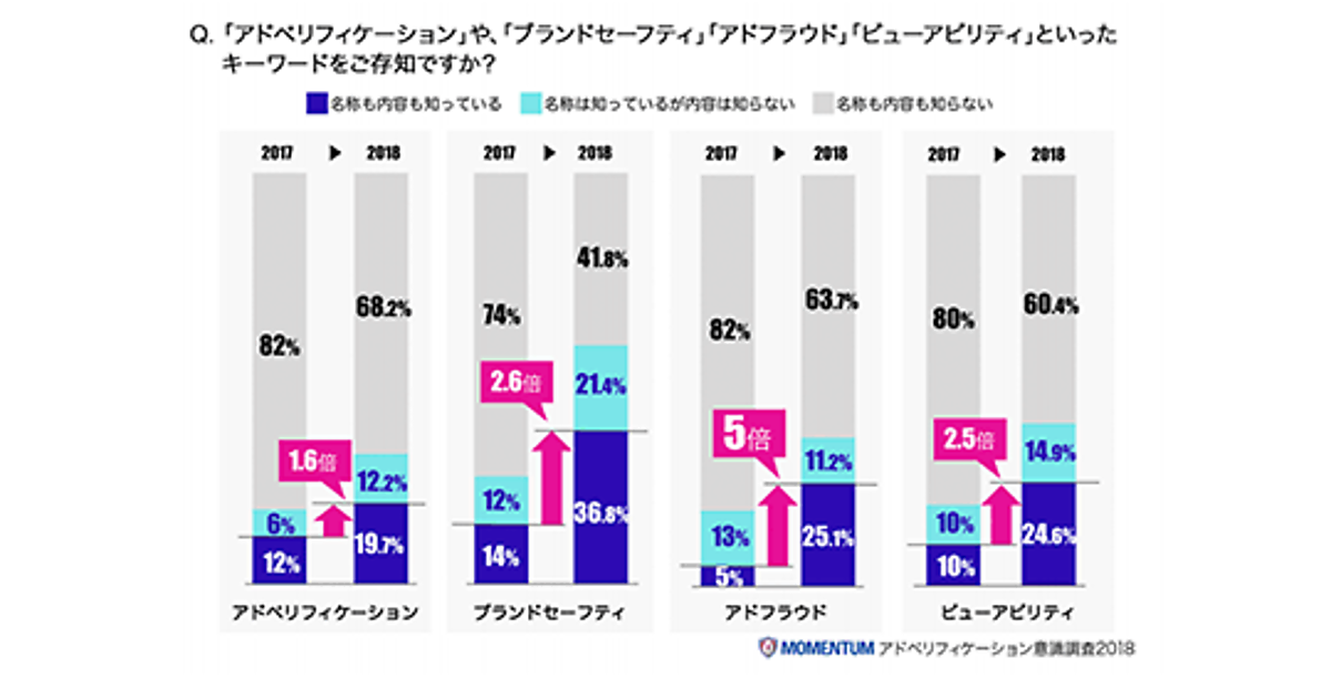 「アドベリフィケーション」「ブランドセーフティ」「アドフラウド」「ビューアビリティ」の4つのキーワードについて認知度を聞いたところ、いずれも2017年10月の調査と比較して大幅な上昇が見られた。
