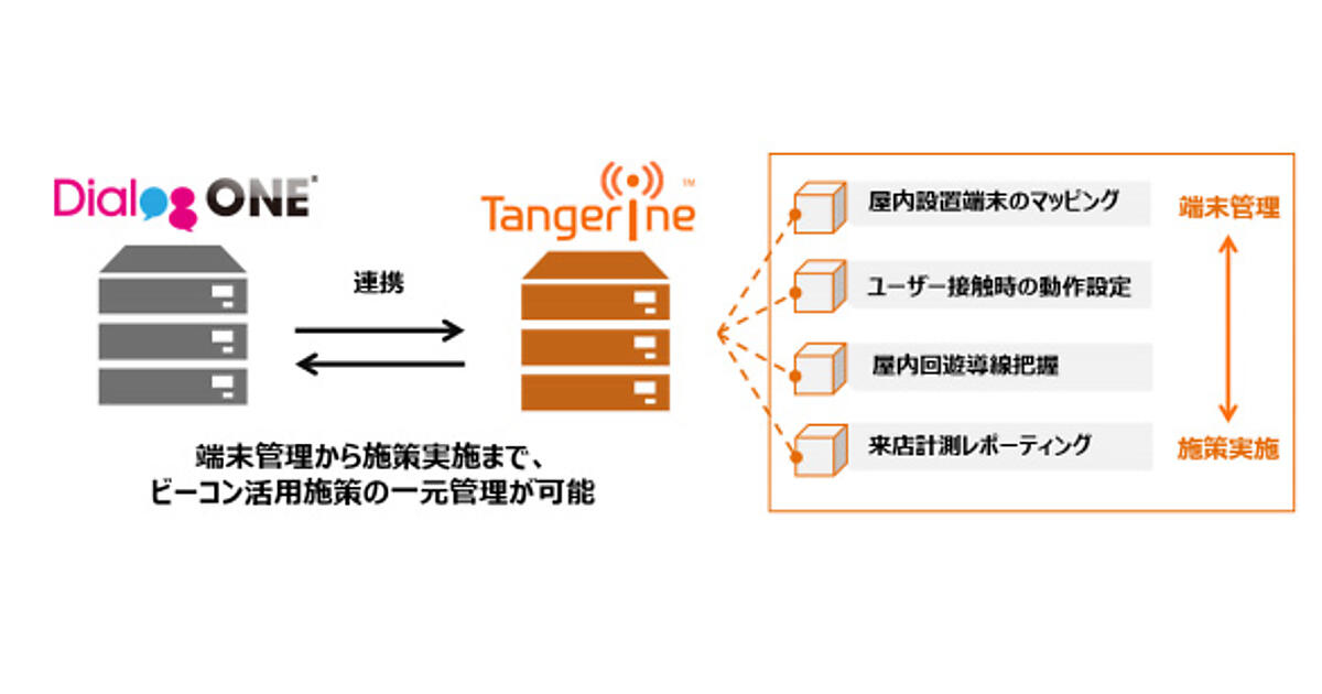 ビーコンは微弱な信号を発信する機器を指し、圏内のユーザーを検知して店舗情報などのメッセージが配信可能。Tangerine nearMEはビーコンを利用して実行動データを蓄積・分析する。DialogOneは広告主の顧客情報と「LINE」「Facebook Messenger」などのアカウント情報を組み合わせて最適化したメッセージが配信できる。