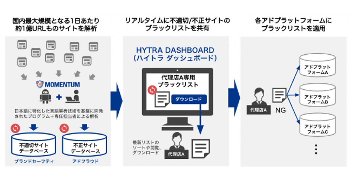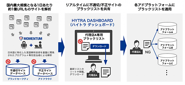 アドフラウドは人ではなく機械による不正な閲覧・クリック、ブランドセーフティは不適当な掲載場所への広告掲載によるブランド毀損(きそん)の防止を意味する。HYTRA DASHBOARDは、モメンタムが収集する毎日約1億URLのサイトから独自基準で不適切・不正と判断したドメインリストで、リアルタイムに更新して提供する。