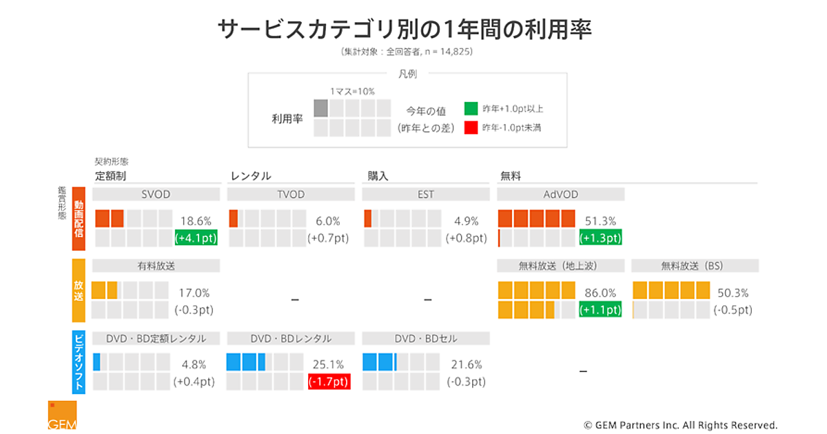 DVD・BDレンタルの利用率が1.7ポイント減少し、25.1%に。TVOD(レンタル型動画配信:Transactional VOD)の利用率は+0.7ポイントの6.0%となった。