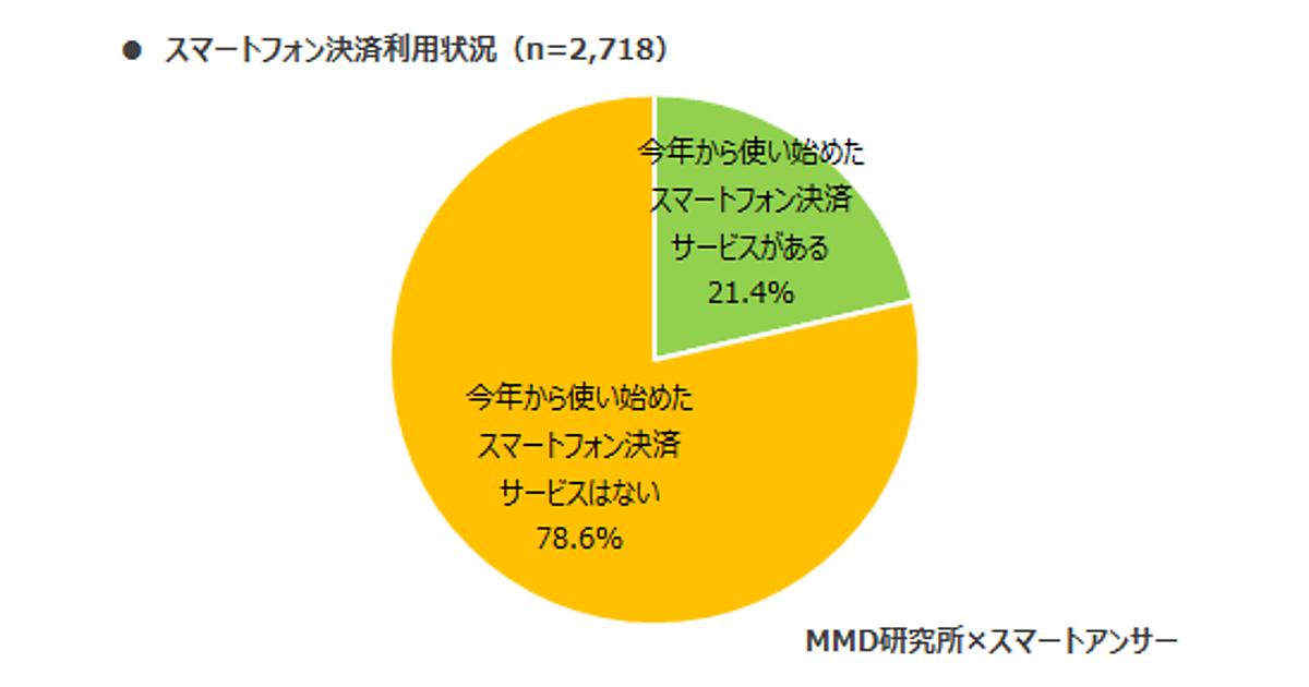 スマートフォン所有者(n= 2,718)を対象に、今年から利用し始めたスマートフォン決済について聞いたところ、「今年から使い始めたスマートフォン決済がある」と回答した人は21.4%だった。