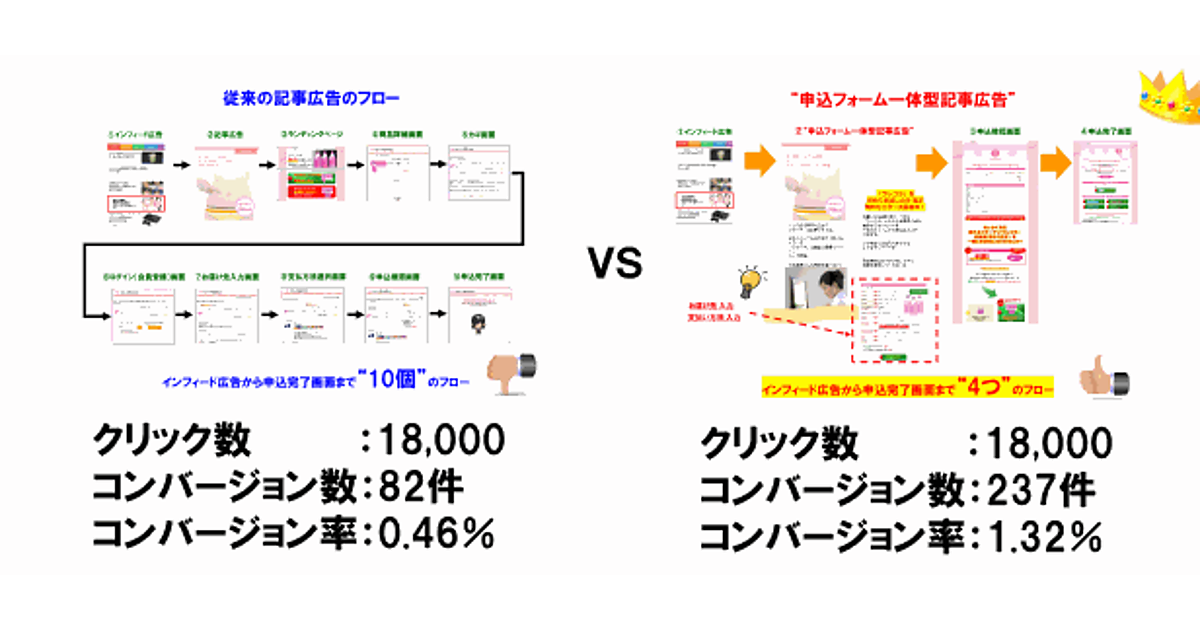 「申込フォーム一体型記事広告」は、フィード広告から申込完了までの画面移動を減らすことで、CVR向上を図る施策となっている。