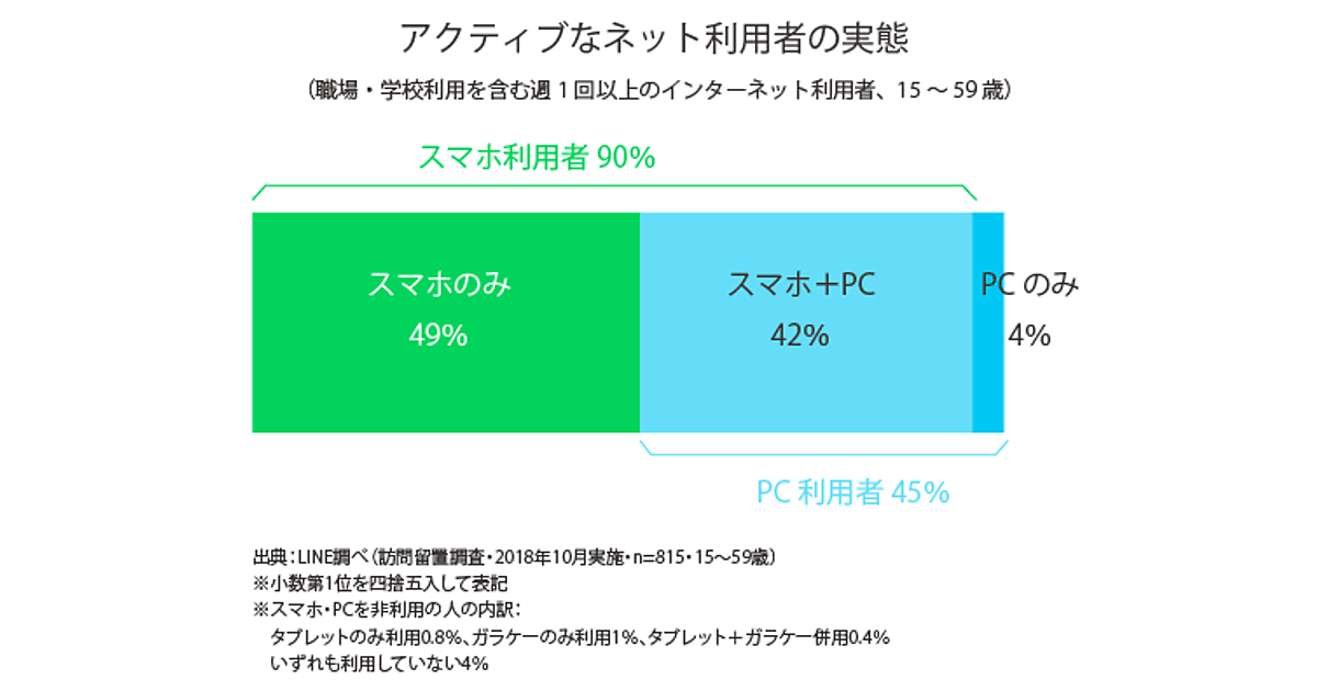 LINEは、インターネットの利用環境に関する調査を実施した。LINEでは、2年前より半期に一度スマートフォン等でのインターネット利用に関する定点調査を行なっている。今回は2018年下期の調査結果となっている。