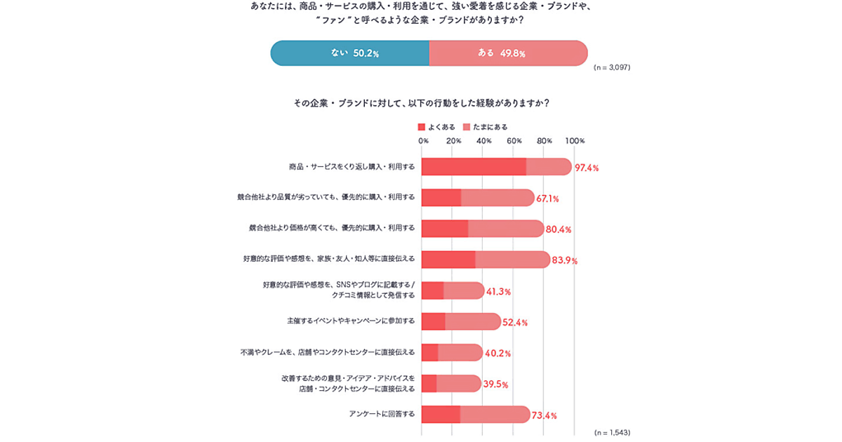 「商品・サービスの購入・利用を通じて、強い愛着を感じる企業・ブランドや、“ファン”と呼べるような企業・ブランドがありますか?」との問いに対して「ある」と回答したのは49.8%。その回答者が対象企業・ブランドについて取ったことのある行動を聞いた結果は以下のとおり。