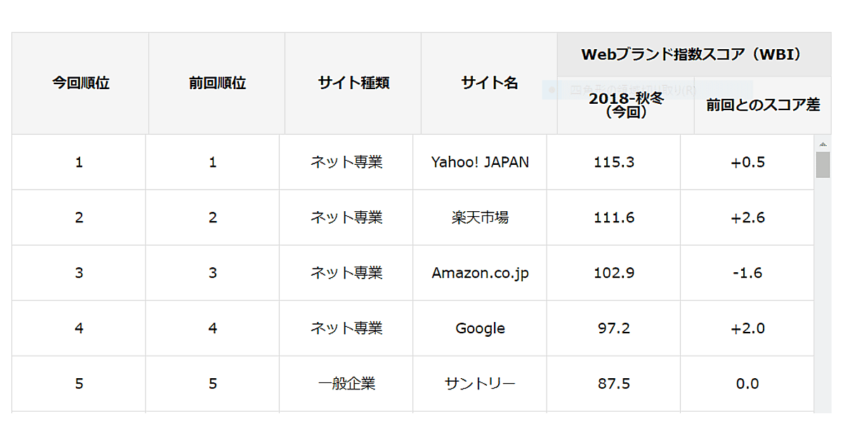 | 一般企業内順位 | 全体順位 | サイト名 | Webブランド指数スコア(WBI) | |
