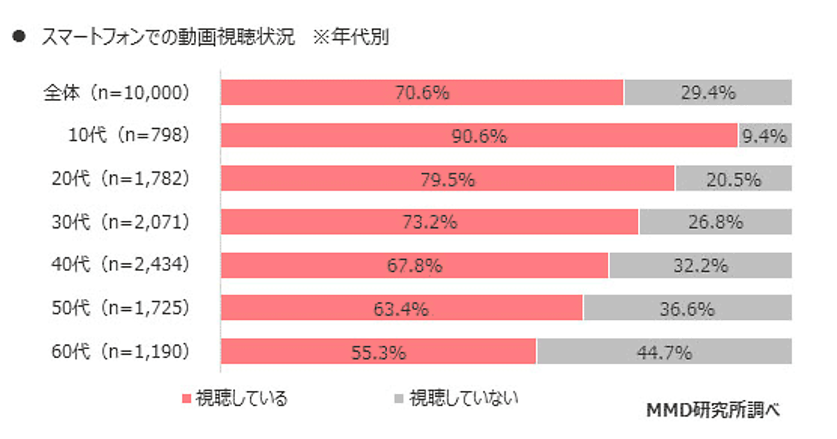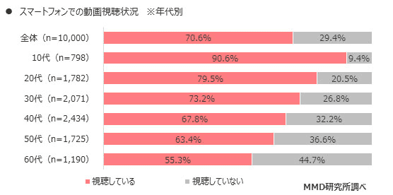 スマートフォンでの動画視聴率は70.6% 10代の視聴率は9割を超え