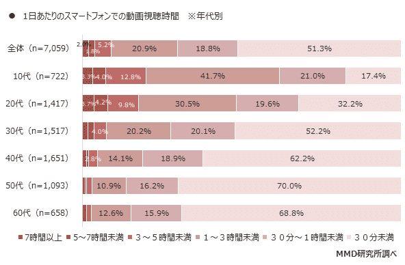 さらに、スマートフォンで動画を視聴していると回答した7,059人を対象に、1日当たりのスマートフォンでの動画視聴時間を聞いたところ、全体でみると「7時間以上」が2.0%、「5~7時間未満」が1.8%、「3~5時間未満」が5.2%、「1~3時間未満」が20.9%、「30分~1時間未満」が18.8%、「30分未満」が51.3%だった。