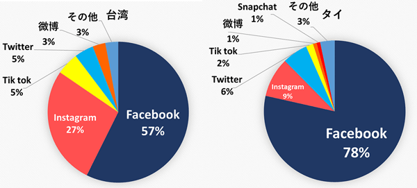 一方、台湾で利用率が高いSNSは57%のFacebook。次いで、27%のInstagramとなっている。