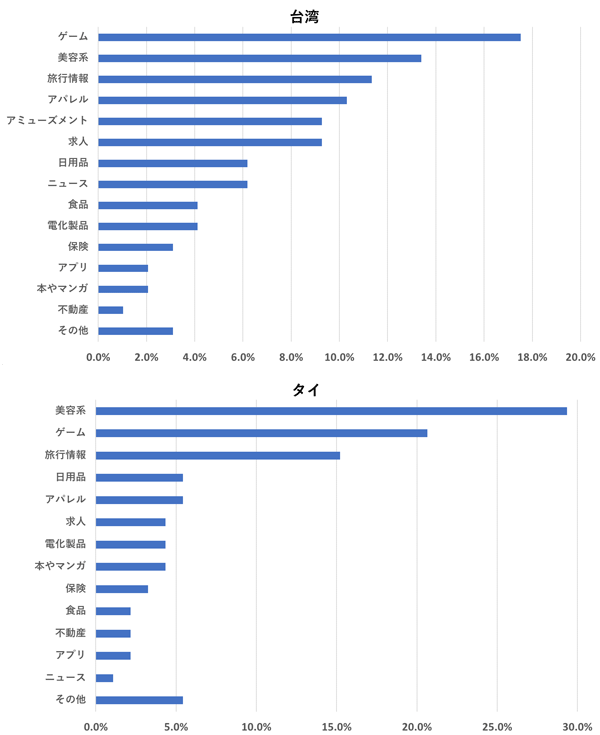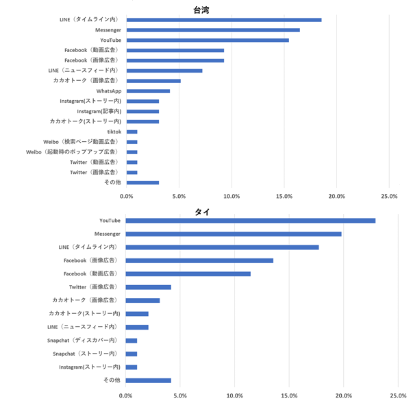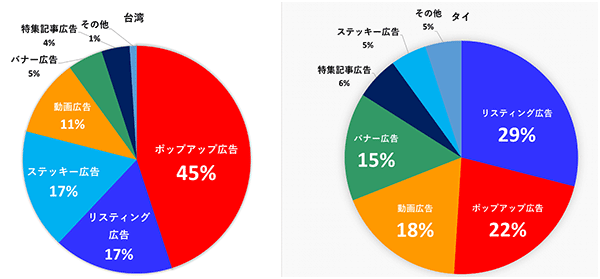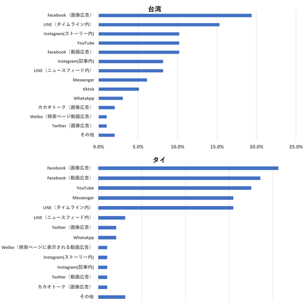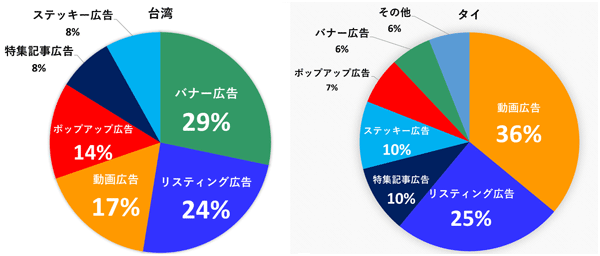 台湾で29%を締めているバナー広告だが、タイではわずか6%。また、動画広告ではタイのシェア率が高く36%を占める結果となった。
