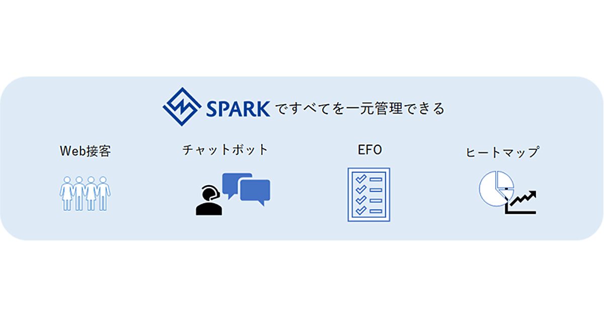 サイト内改善サービス【SPARK】は、誰でも手軽にサイト内改善を行えるよう「Web接客」「チャットボット」「EFO(エントリーフォーム最適化)」「ヒートマップ分析」などの機能を備えたマーケティングプラットフォームである。