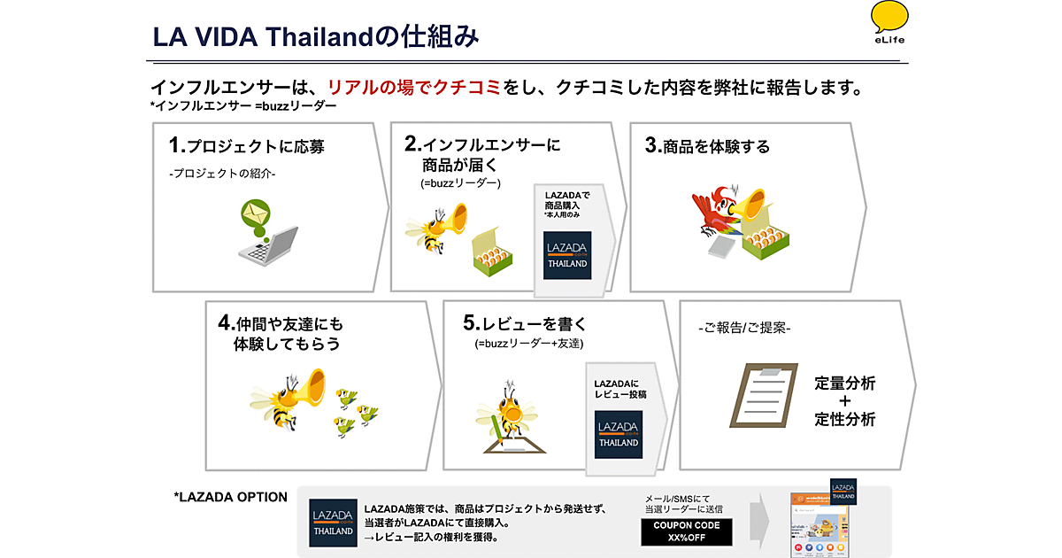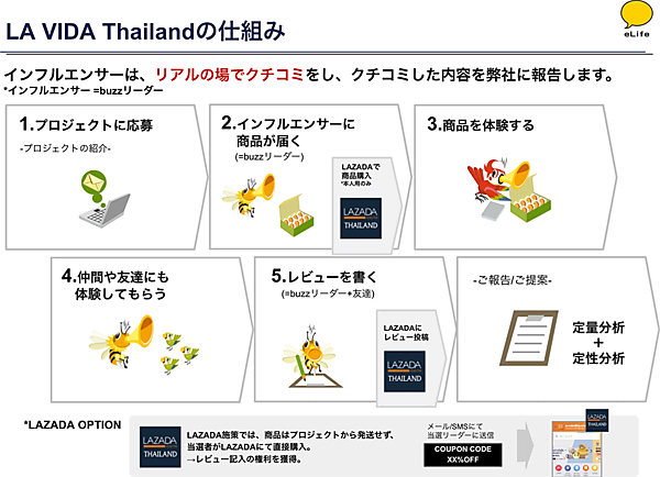 LA VIDA Thailandは、イーライフが「体験をクチコミする商品モニターサイト」として日本で運営し、55万人以上が登録しているクチコミサイト「buzzLife」のノウハウを活用して開発した。現実社会でのクチコミ施策「buzzLife」と、東南アジア最大のECサイト「LAZADA」での施策が中心の「LAZADA buzz」の2種で構成する。