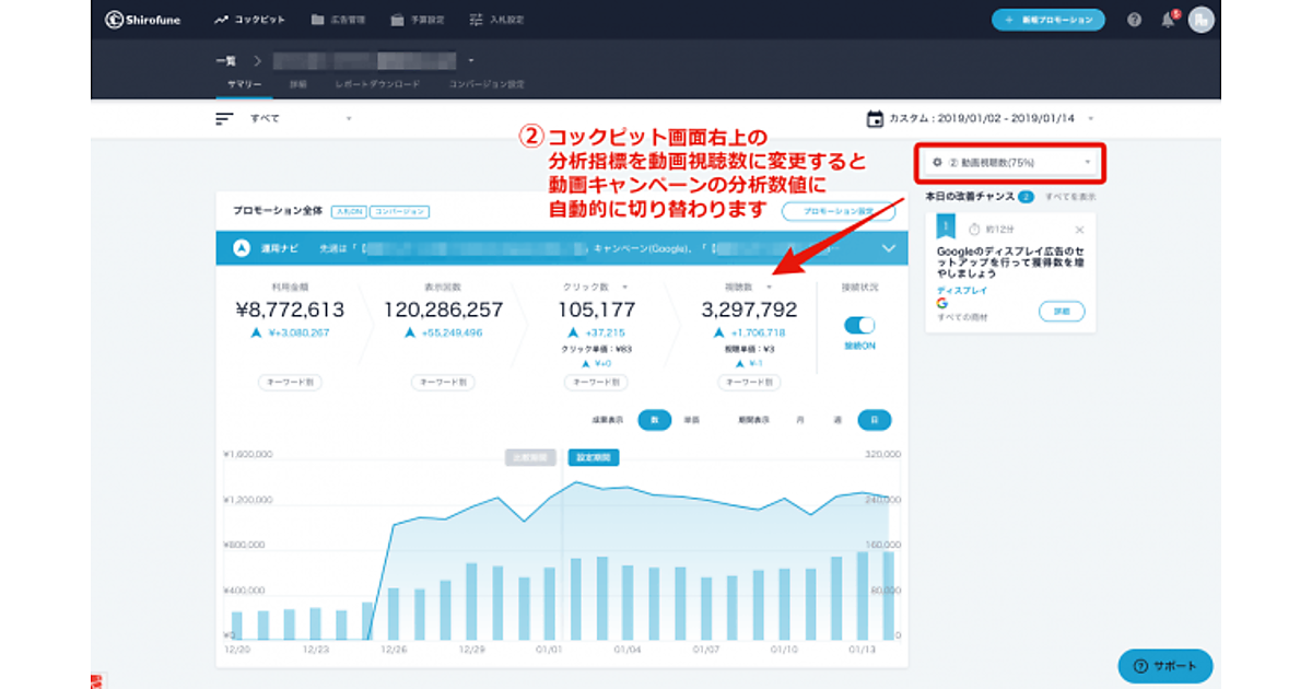 Shirofuneの機能拡張により、利用金額や表示回数、視聴数やクリック数などの視聴分析をShirofuneが情報を収集し、レポート画面の指標を変更するだけで内容が確認が可能となり、他のキャンペーンの分析とまとめて、Excelレポートに出力することが可能になったため、「各媒体を横断した広告運用の一元管理」の幅がさらに広がった。