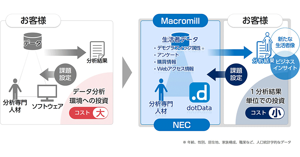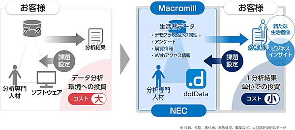 NECとインターネット調査のマクロミルは、共同でAI分析サービスを1月から提供開始する、と1月24日発表した。NECが提供するデータ分析プロセスをAIによって自動化するソフトウェア「dotData」を用いて、マクロミルの保有する生活者起点のデータ(年齢などの属性情報、購買履歴、アクセスログなど)を分析し、企業の希望する「顧客に特徴的な属性や行動特性」などを明らかにするものとなる。