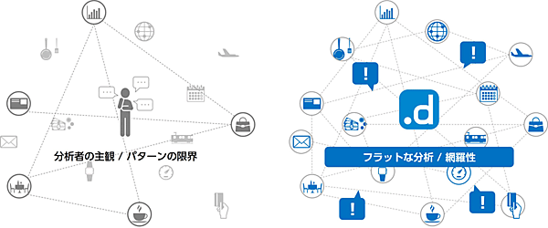 サービスの活用により、企業は自社で、データ収集・蓄積、分析ツールの導入、分析専門人材の確保などをしなくてはならないという課題を解決でき、同時に属人的な分析からの脱却、そして複数種類の大量データを同時に分析することが可能となる。