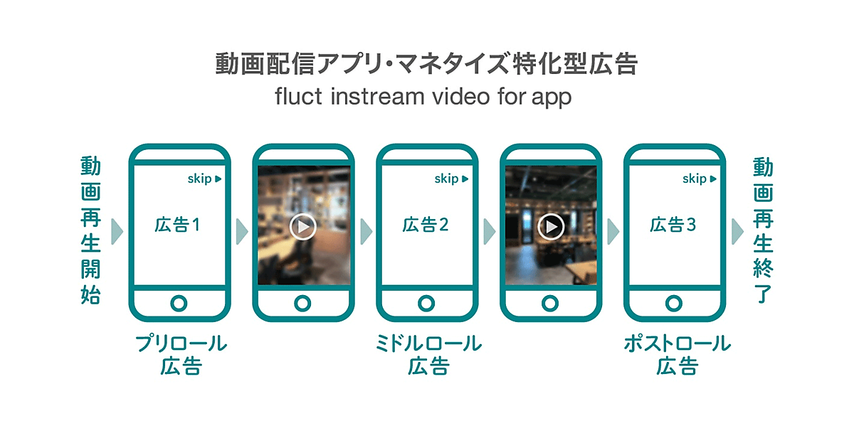 fluct instream video for appは、動画コンテンツの再生前に挿入される「Pre roll(プリロール)」、コンテンツの途中に挿入される「Mid roll(ミッドロール)」、コンテンツ終了後に挿入される「Post roll(ポストロール)」、またライブ配信中の動画広告挿入など、あらゆるタイミングにおいて配信が可能となる。