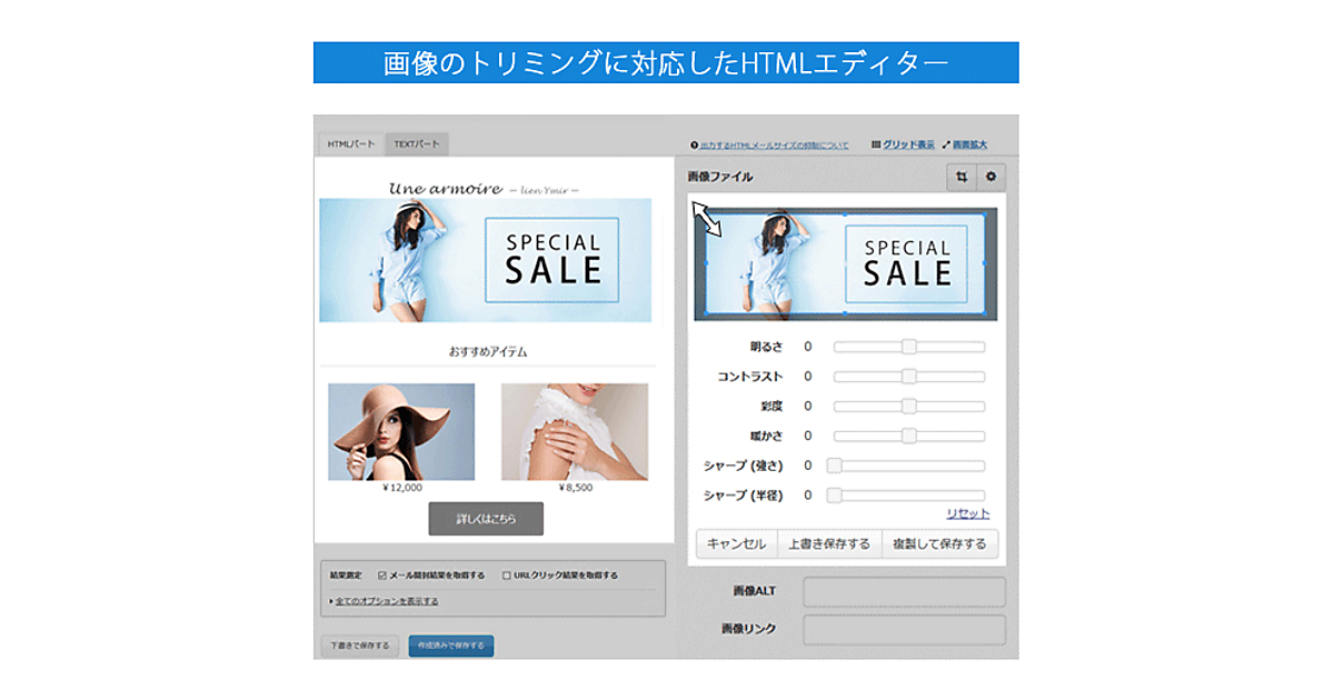HTMLエディターには加えて、画像の一部切り出し(トリミング)や明るさ、コントラストが直接変更できる機能も追加し、画像の加工処理の手間を軽減する。分析ツールは、メールの開封・クリック数による顧客の抽出を可能にした。好反応の顧客に新たなメールキャンペーンを行うなど効果的なメールマーケティングができる。