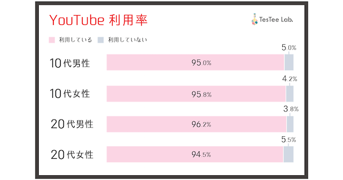 YouTube の利用率は95%。利用者の満足度は、10代で9割、20代で8割